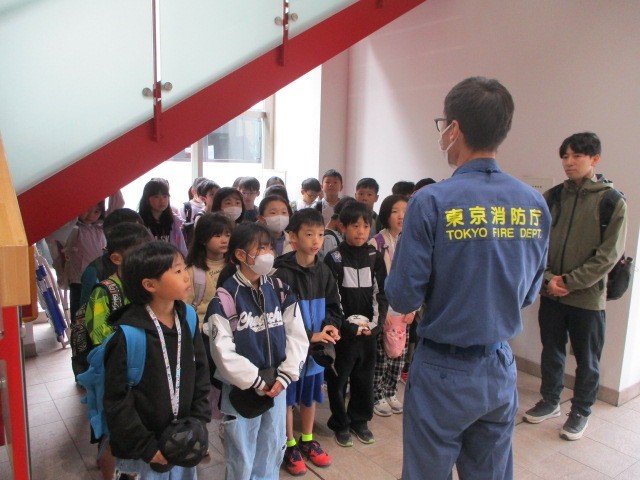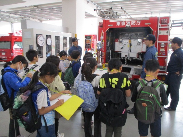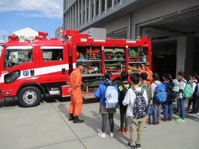 消防署の建物の中で消防署に関する説明を聞いて、消防車を見学しました。たくさんいろいろな道具や設備を積んでいる様子を間近で見させていただきました。