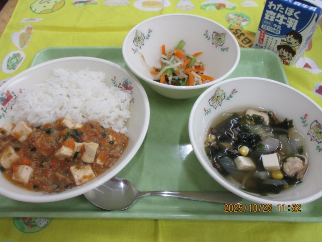 ごはん おとうふたっぷりマーボー おとうふ入りわかめスープ 3色ナムル 牛乳