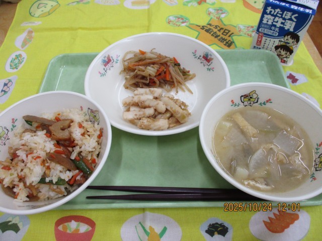 大山おこわ いかの香味炒め 呉汁 野菜のお浸し 牛乳