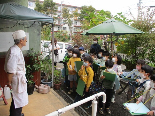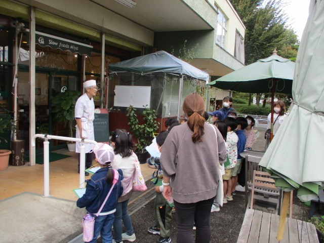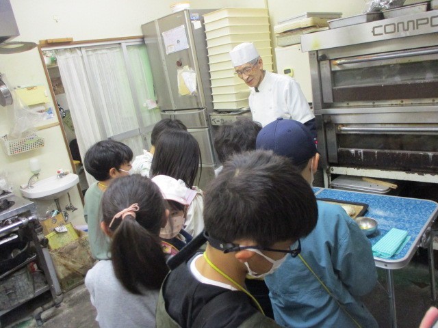 生活科「まちたんけん」で、鹿島商店街の「スローフーズ ミヤ」さんに伺いました。パン屋さんの仕事について、いくつかの質問に答えてくださいました。