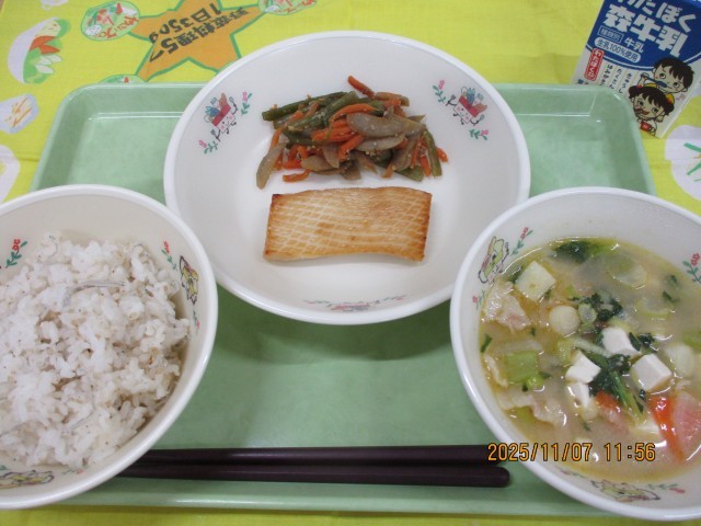 明日、11月8日は語呂合わせで一一八 イイハの日です。よい歯を守るには、よく噛んで食べることが大切です。そこで、今日の給食は噛み応えのある食材を多く取り入れた献立です。具体的には…いか・茎わかめ・ちりめんじゃこ…などです。今日は野菜の切り方も噛み応えのあるように工夫して作りました。