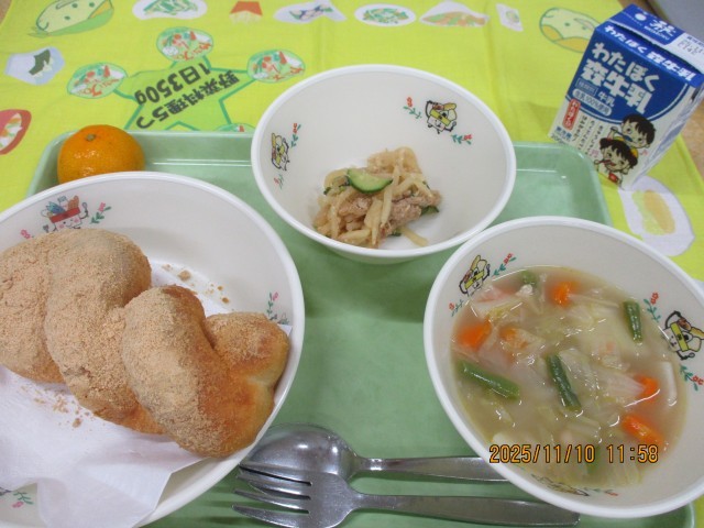 きな粉揚げパン かぶ入りポトフ 大根とツナのサラダ 果物(みかん) 牛乳