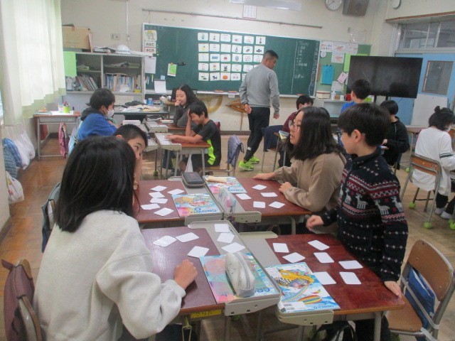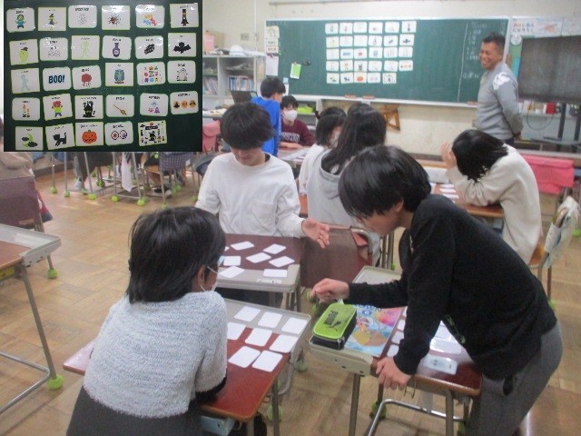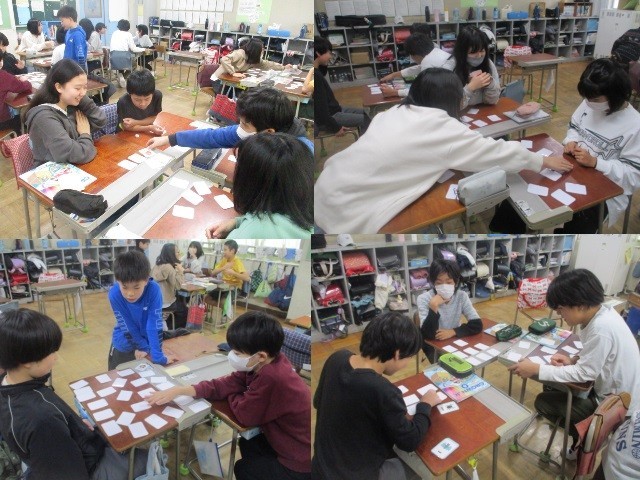 英語の学習です。カードに書かれた英語を発音しながら、神経衰弱ゲームを行っていました。何枚取れたかな?