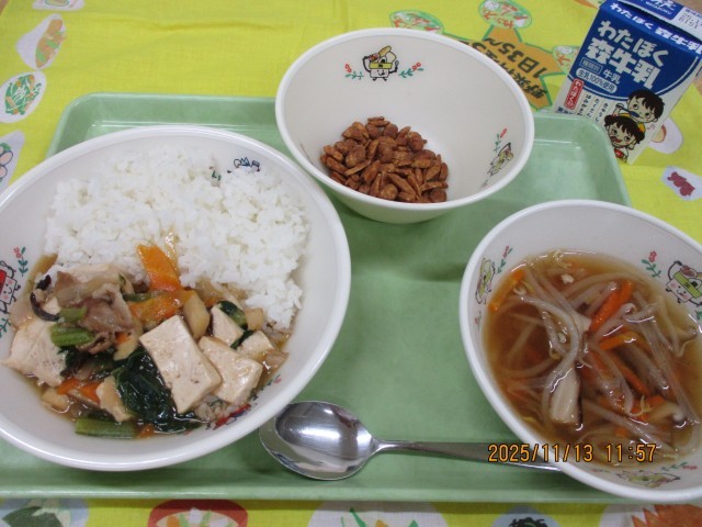 ごはん 五目豆腐 もやしスープ 豆ナッツ黒糖 牛乳