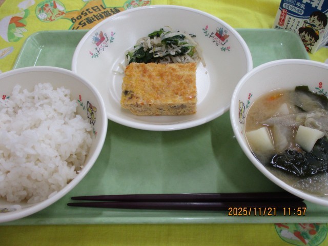 八王子産の白いごはん 卵焼き 小松菜じゃこ炒め はっちくんのみそ汁 牛乳