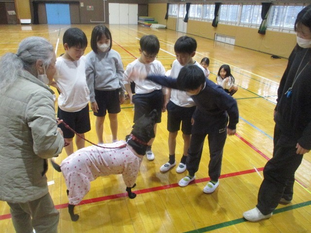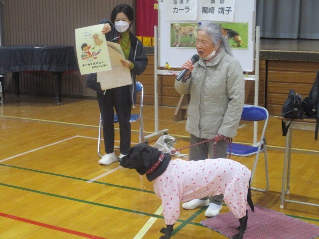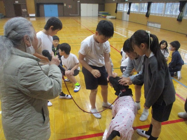 最初に、事前に書いたみんなからの質問に答える形で、視覚障害のこと・盲導犬のことをお話ししてくださいました。ハーネスを付けているときは、仕事モード。外すと、仕事から解放されて、ただのワンちゃんになります。後半、ハーネスを外して、みんなと触れ合いました。