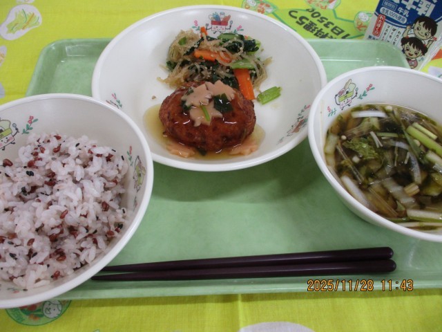 今日の給食は「日本遺産献立」として「高尾山御膳」を作りました。それぞれの献立が高尾山をイメージして作られた献立から構成されています。例…天狗ごはん:高尾山は古くから天狗の住む山と言われています。赤米でご飯を色付けし、天狗の帽子を黒ゴマで表したごはんです。