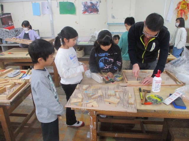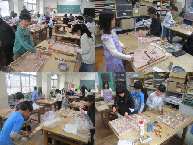 図工「トントンくぎ打ち。コンコンビー玉」【おもしろいビー玉コースをつくろう!】【ビー玉の動きが変化することをイメージ!】図工室にかなづちの音とのこぎりの音が響いていました。大作ができそうな感じで、楽しみです。