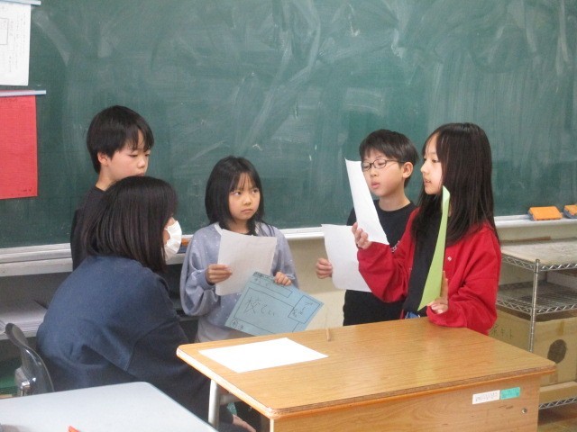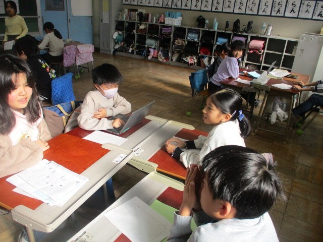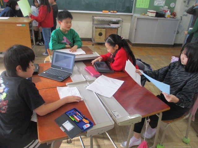 「学校の不思議」をグループで発表するための準備をしていました。発表原稿を書いて、確かめていました。