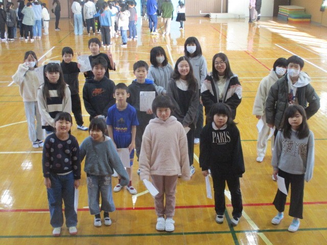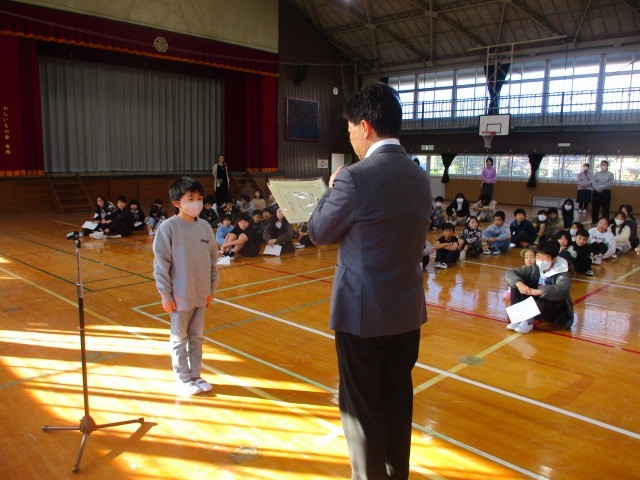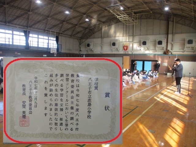 夏休みに行った自由研究を「調べる学習コンクール」として出品しました。その中で、優良賞をもらった児童を表彰しました。また、2年生と3年生から多数の応募があったため、「学校賞」をいただきました。朝会の後は、恒例の発表者の撮影会です。