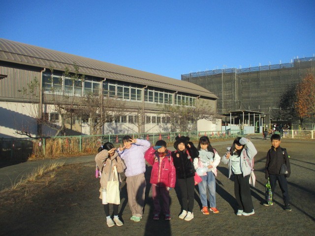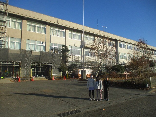 冬晴れの朝です。新しく塗り替えられた校舎と体育館の前で、登校してきた子供たちと…。