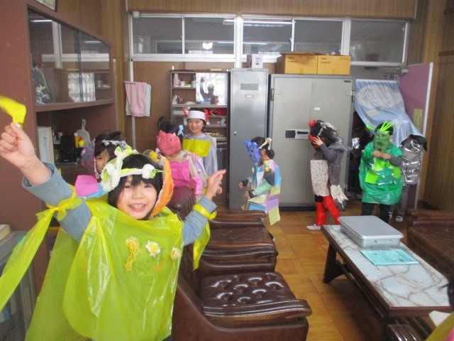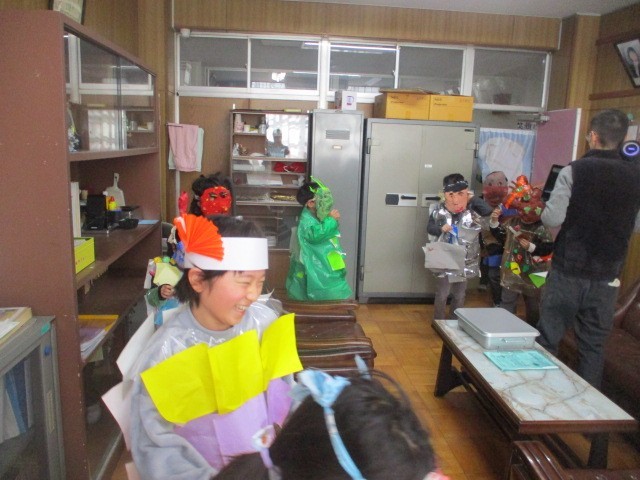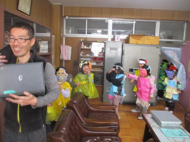 校長室に、音楽とともに仮装パレードが始まりました。