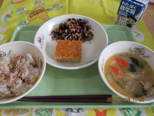 さつまいもごはん 厚焼き卵 ひじきの炒め煮 具だくさんみそ汁 牛乳