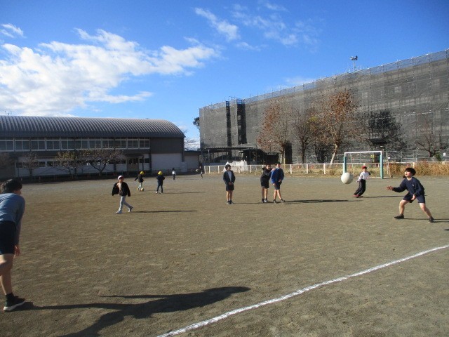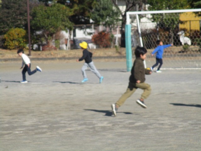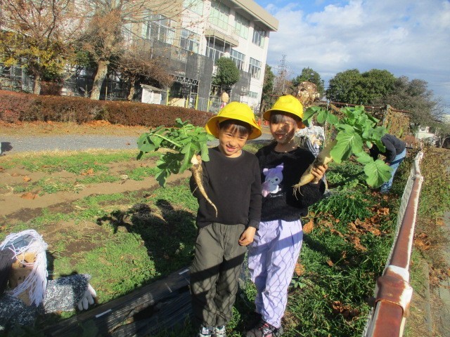 冬至の日。良く晴れた校庭の昼休み。子供たちは、元気に走り回っていました。畑では、だいこんを抜いている1年生がいました。