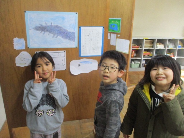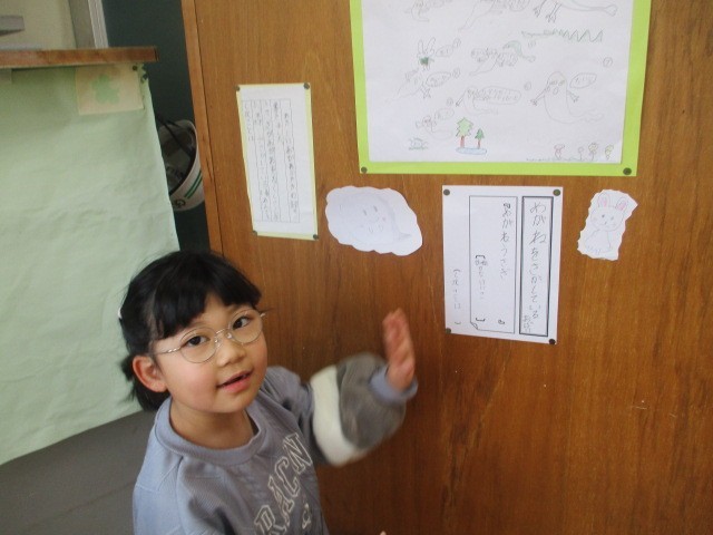 中休み・昼休みに算数教室で2年生による「お話美術館」が開催されていました。今日は、その最終日でした。