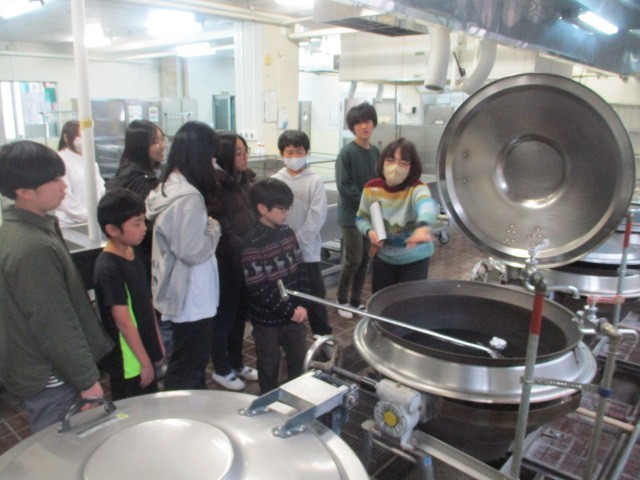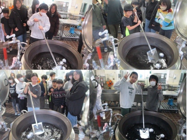 昨日で給食が終わりましたが、片付けが終わった給食室を見学させてもらいました。大釜で調理をする体験もさせてもらいました。いつもおいしい給食をありがとうございます。