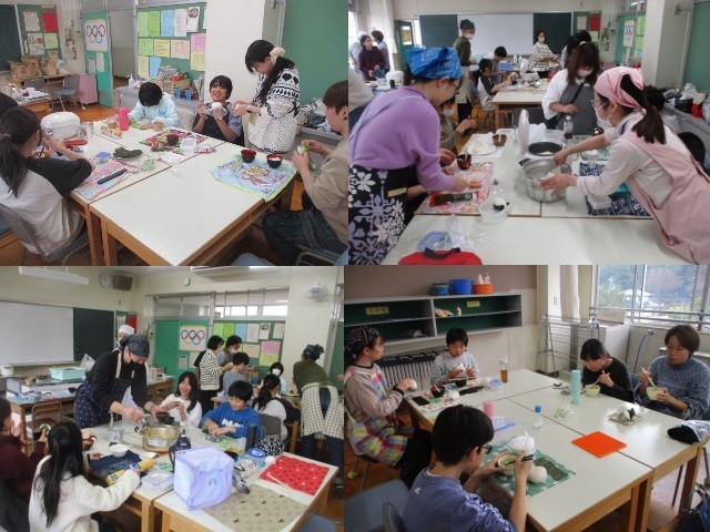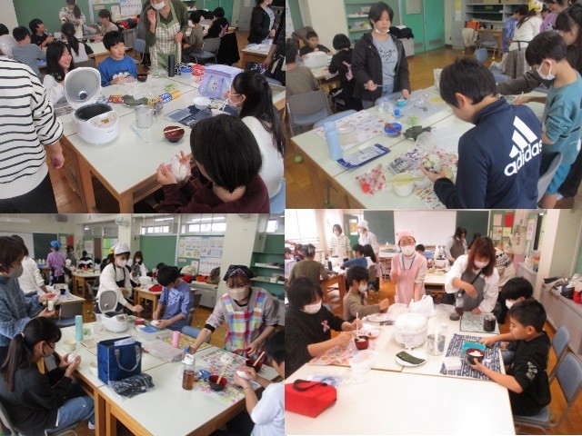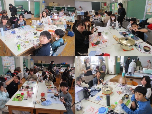 学校の水田で作ったお米、稲刈りを干しました。その精米されたお米を保護者の皆さんで炊いてもらい「おにぎりパーティー」をしました。豚汁と一緒に、全員でおいしくいただきました。私もいただきました。「おいしかったです。ごちそうさまでした。」