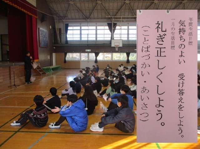生活指導の先生から1月の生活目標の話がありました。あいさつは、基本ですね。