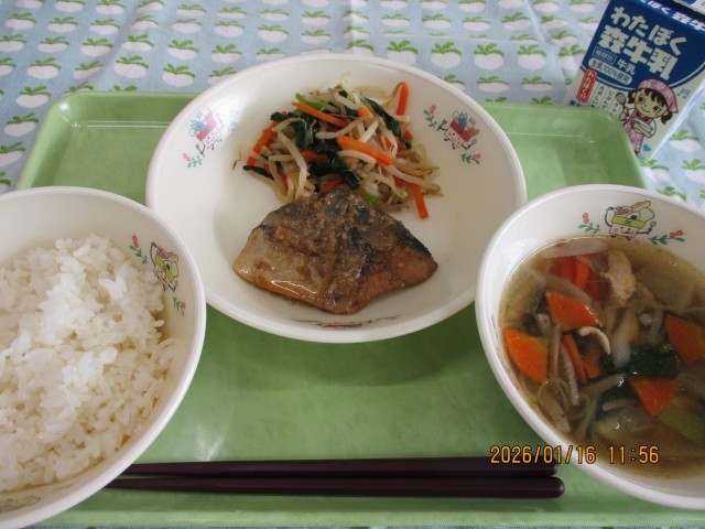 ごはん さばのごまみそ煮 もやしのからしあえ きりたんぽ汁 牛乳