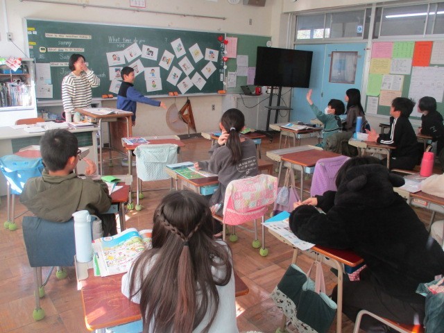 外国語「Try 一日の生活」一日の生活を表したカードが黒板にたくさん貼られていました。この中から2~3を一人の子供が隠して、その間みんなは、目を伏せて見えないようにしていて、隠されたカードが何かを当てるゲーム。子供の記憶力に驚きました。