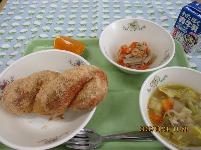 今日の給食は、みんなの大好きなきな粉揚げパンでした。クラスによってはパン箱(クラスに分けられたパンを入れるケース)の底に残った「きな粉」の粉まできれいに食べるクラスもありよく食べてくれました。揚げパンの人気は不滅ですね。