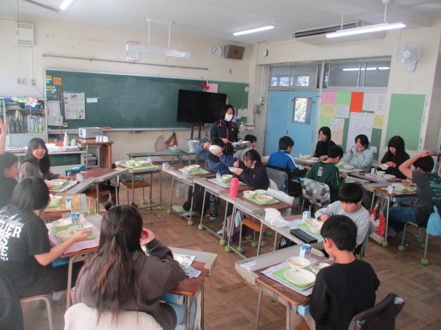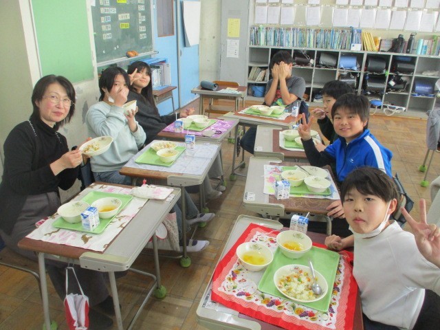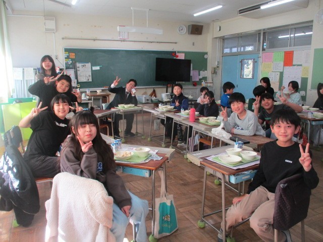 私も子供たちに囲まれて、楽しく給食を食べました。ごちそうさまでした。