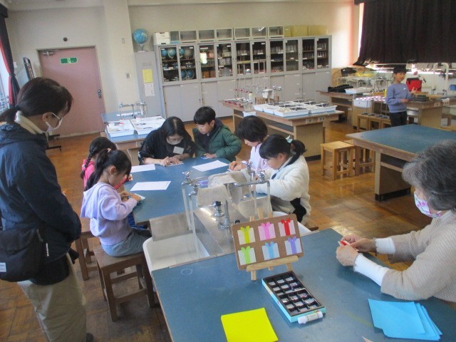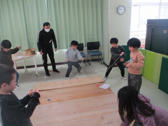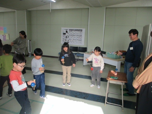 地域の方々、保護者のボランティアのご協力で、昔遊びを体験しました。「けんだま」「こま」「おりがみ」のコーナーです。