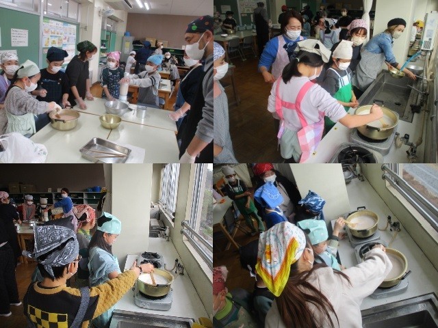ゲストティーチャーに来てもらい、こんにゃくづくりに挑戦です。まずは、こんにゃく芋をミキサーにかけて、煮ます。