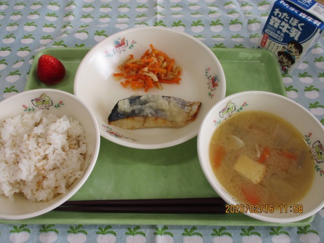 ごまごはん・鰆のゆずおろしあんかけ・にんじんしりしり・田舎汁・果物(いちご)・牛乳