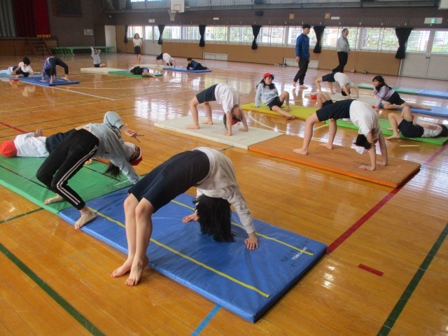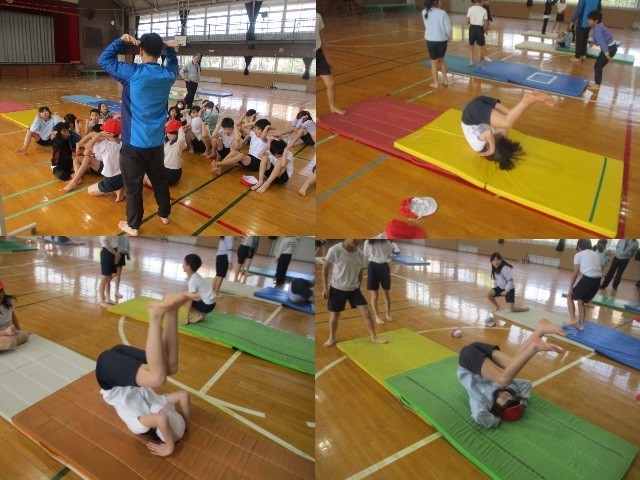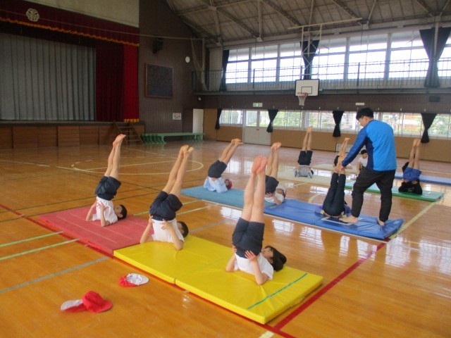 体育館でマット運動をしていました。ウオーミングアップを兼ねて、肩倒立やブリッジを行い、最後に後転を練習していました。小学校時代にこのような運動をすることは、とても大切です。