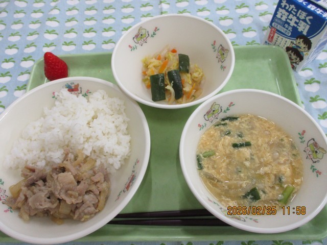 ごはん・豚の生姜焼き・ピリカラ白菜・にら玉みそ汁・いちご・牛乳