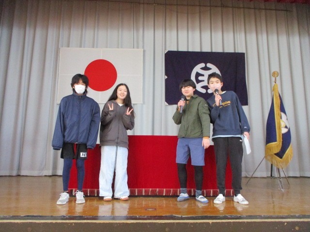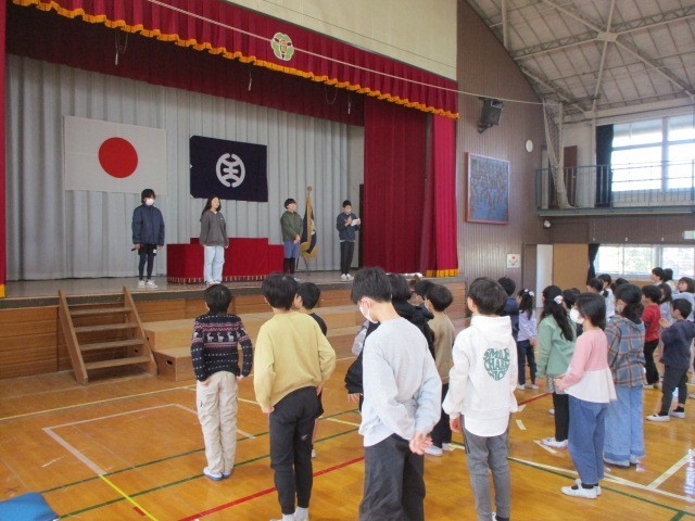 今朝の児童集会は、環境整備委員会、図書委員会、保健・体育委員会、放送委員会の委員長さんが、それぞれの活動内容と感想を発表してくれました。鹿島小学校のために1年間一生懸命に活動してくれて、ありがとうございました。おつかれさまでした。