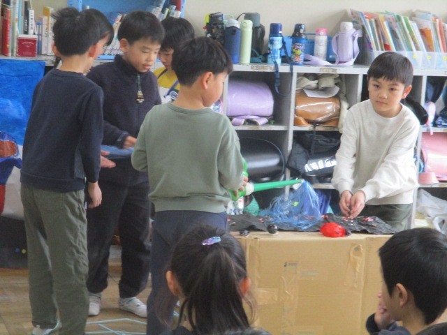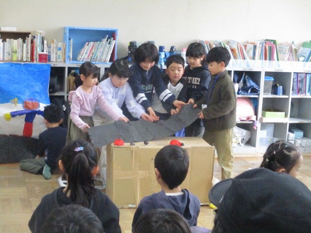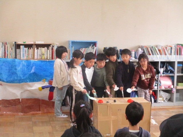 2年生が1年生に頑張ってきた「大根の育て方」を劇で発表しました。