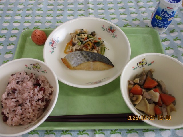 【卒業お祝い献立】赤飯・鰆の西京焼き・いりどり・彩和え・果物(いちご)・牛乳