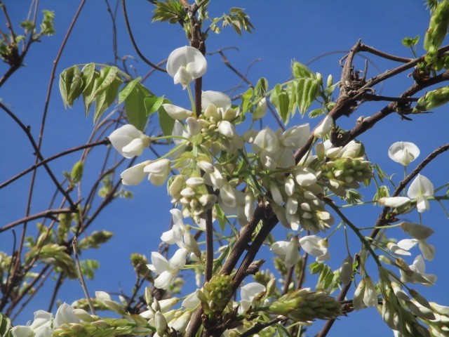 青空が広がっています。正門のしだれ桜も咲いています。藤の花も咲き始めました。