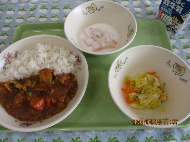 今日の給食は、みんな大好き「カレーライス」でした。1年生も給食2回目にして少し緊張も解けた感じがして楽しんでいる様子でした。