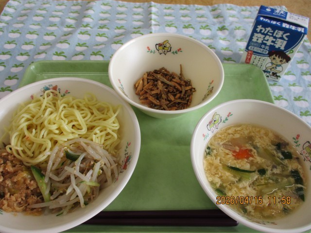 ジャージャー麺・青梗菜と卵のスープ・ごまめナッツ・牛乳