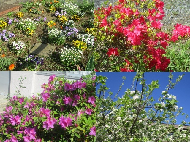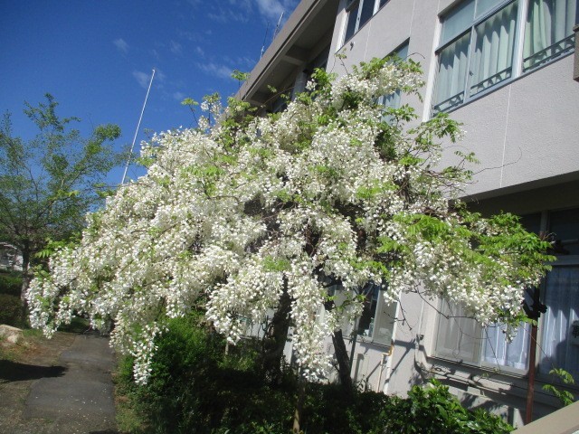 今年も職員昇降口のそばに咲いている藤の花にクマバチ(クマンバチ)がやってきました。大人しいハチで、ホバリングしていて、動くものによって来るクマバチは、オスで毒針を持っていませんから刺しません。クマバチのメスが刺すのは、巣をいじられたときとか、身体をつかまれたり、攻撃されたりしたときです。毒性は低いですが、針が太いので痛いそうです。私も刺されたことがないので、分りませんが。騒がずに優しく見守ってあげてください。校庭にもリンゴの花をはじめ、いろいろな花が咲き誇っています。
