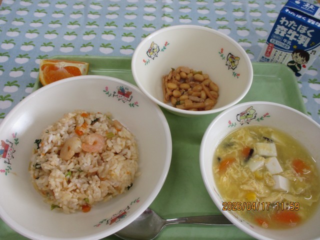 エビチャーハン・鶏肉と大豆の炒め物・中華風玉子とコーンのスープ・果物(清美オレンジ)・牛乳