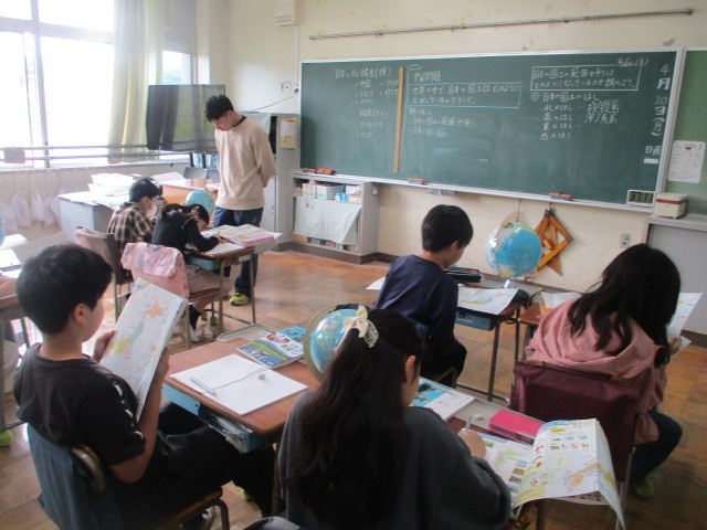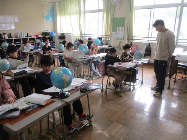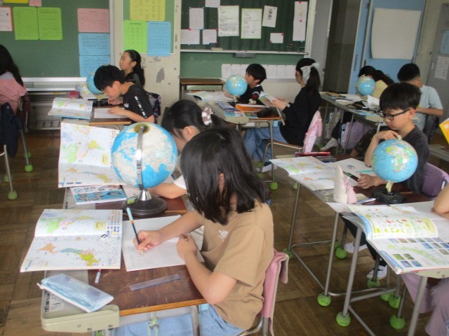 社会科でした。地球儀と地図を見ながら、日本の国土を確かめていました。東の端が「南鳥島」、昔、ややっこしいなと思っていました。