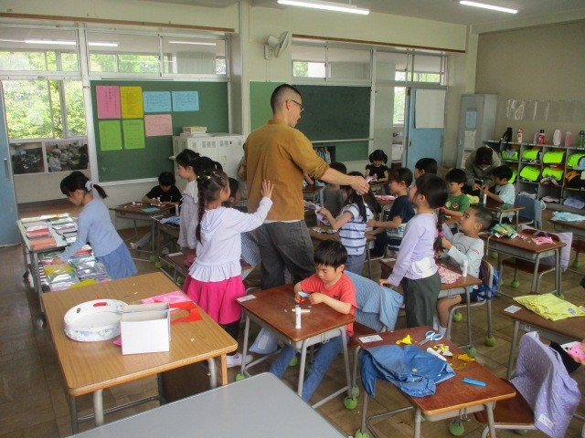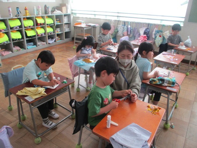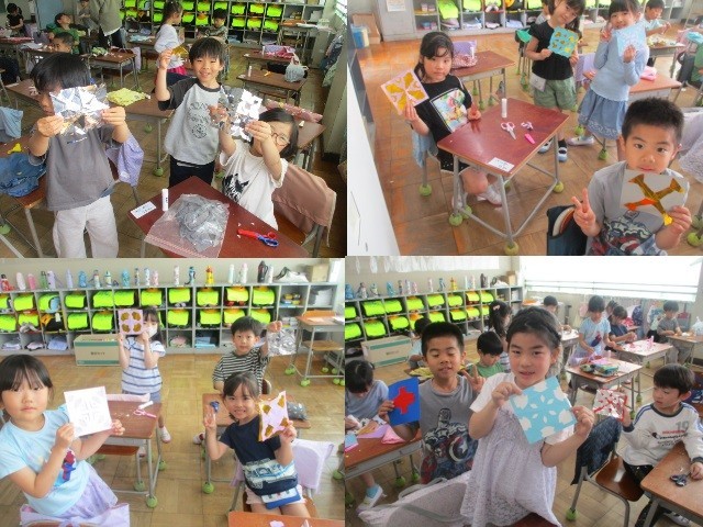 図工の時間です。はさみを使って、折り紙を切って、オリジナルの模様を作ります。それをもう1枚の折り紙にステックノリで貼って出来上がり。これもこれから学習する基礎がいっぱい詰まっています。