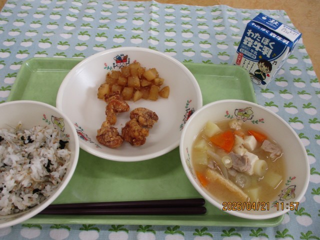わかめごはん・鶏肉のコロコロ揚げ・豚汁・ごま大根・牛乳