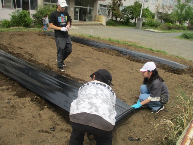 畝(うね)が出来上がったら、マルチシートを張ります。みんな協力して、うまく張れました。今年は、たくさん鹿島イモが獲れるといいですね。
