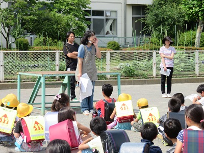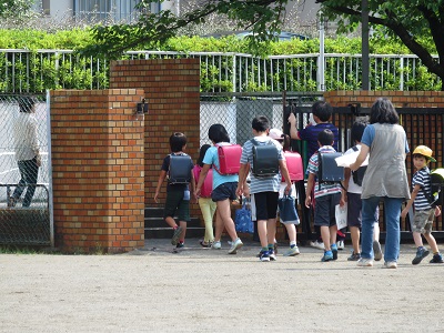 本日は、集団下校でした、暑い日差しがまだ残る、14時20分頃。初めて、一年生も加わっての下校となりました。高学年のお兄さん、お姉さんの声を聞いて、無事、安全に下校することができました。緊急時に備えて、方向別に帰宅する訓練を、今後も行っていきましょう。