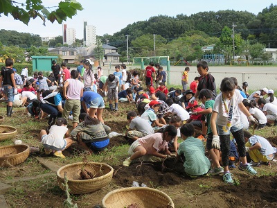 真夏を思わせるような陽ざしの中、子どもたちが楽しみにしていた芋ほりの日がやってきました。