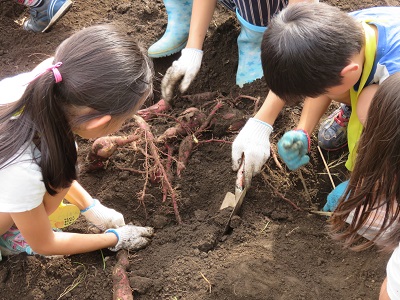 「やった!大きいの発見!」「根っこばかりでさつまいもがいません!」などなど、さまざまな声が飛び交いました。また、芋ほりに苦戦している下級生を優しく手伝う上級生の姿が印象的でした。
