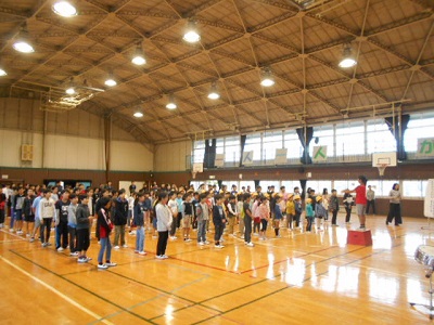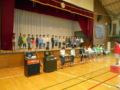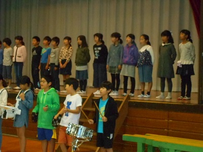 4年生の教科書に載っている「もみじ」を、収穫祭で発表するための練習として、全校児童で歌いました。