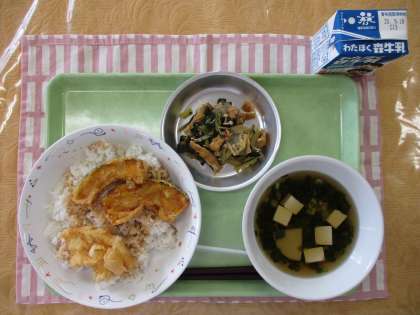 天丼にはイカとかぼちゃの天ぷらがのっています。かぼちゃが甘くて子供たちに人気でした。お吸いものには東京湾でとれた海苔を使いました。ふわっと海苔の良い香りが感じられるお吸いものでした。小松菜は江戸川区の小松川が名前の由来となったと言われている野菜です。今日の小松菜は東京産の小松菜を使っています。