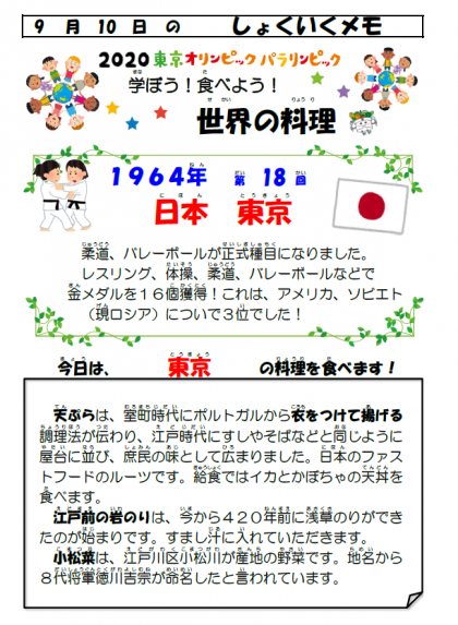 来年開催される東京オリンピックに合わせ、八王子市の小学校ではこれまで夏季オリンピックが開催された国の料理を2019年から毎月1つずつ給食に取り入れています。今日は1964年に開催された東京オリンピックにちなみ、日本・東京の料理を食べました。