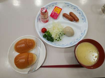 ウィンナー、味付け玉子、生野菜、コーンスープ、ヤクルト、バターロール、ジャム&マーガリン